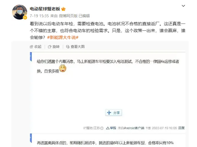 驱动中国2023年7月21日消息,近日,有传闻称未来新能源汽车年检会增加电池检测项目,电池状态不合格将直接返厂维修或者更换。值得注意的是,挑选的是6年以上新能源车型,而且合格率只有10%。