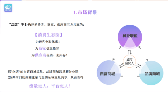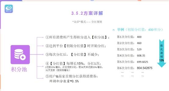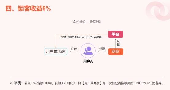 (二)商家:低成本获客与持续收益 商家通过自主让利吸引流量,同时享受平台公域流量导流与私域流量沉淀。例如,水果店入驻后日客流量增加50%,销售额显著提升。商家还可通过异业联盟共享18万家商家的私域流量,降低营销成本。此外,商家绑定顾客后可获得其后续消费积分的5%作为回馈,形成长期收益来源。