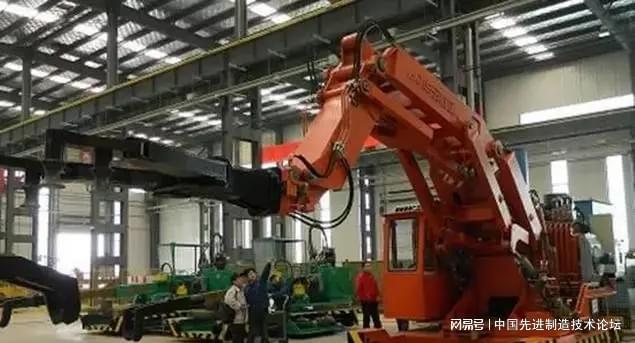 青岛华东工程机械有限公司研制的全液压重载机器人如图所示。其大跨度的承载可达到2000kg,机器人的活动半径可达到近6m,应用在铸锻行业。